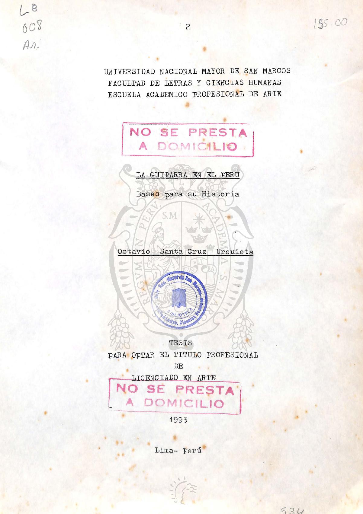 Santa Cruz, O. (1993). La guitarra en el Perú. Bases para su Historia [Tesis para optar el Grado de Licenciado en Arte]. Universidad Nacional Mayor de San Marcos. Facultad de Letras y Ciencias Humanas. Unidad de Pregrado.
