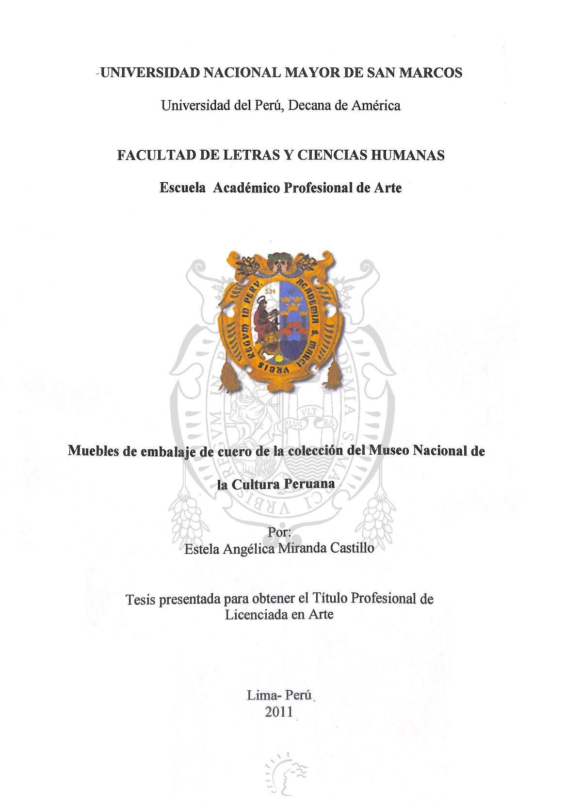 Miranda Castillo, E. (2011). Muebles de embalaje de cuero de la colección del Museo Nacional de la Cultura Peruana [Tesis para optar el Grado Académico de Licenciado en Arte]. Universidad Nacional Mayor de San Marcos. Facultad de Letras y Ciencias Humanas. Unidad de Pregrado.