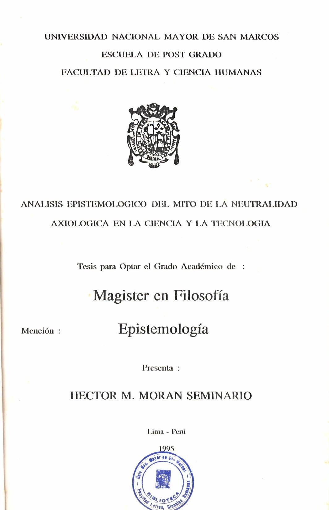 Moran, H. (1995). Análisis epistemológico del mito de la neutralidad axiológica en la ciencia y la tecnología. [Tesis para optar el grado de Magíster en Filosofía]. Universidad Nacional Mayor de San Marcos. Facultad de Letras y Ciencias Humanas. Unidad de Posgrado.