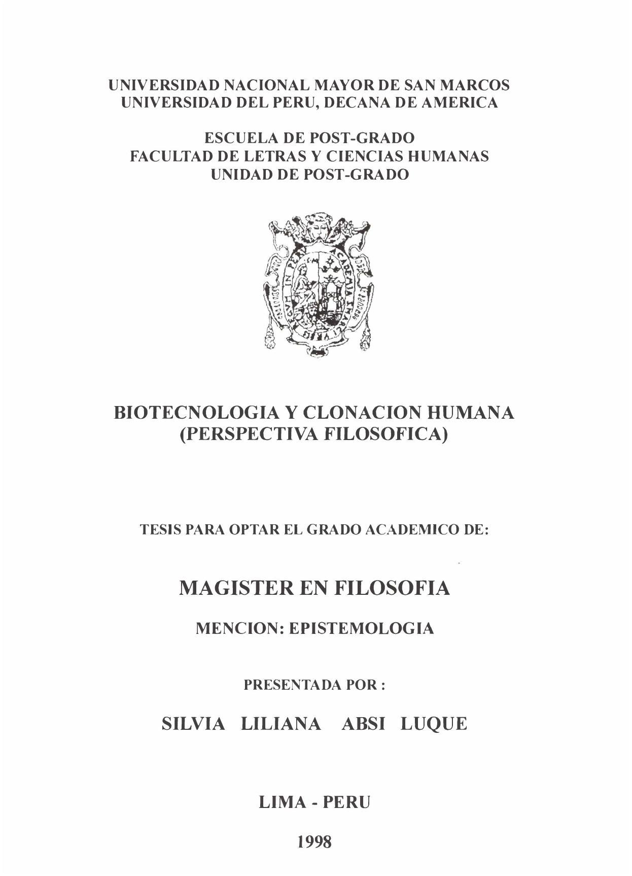 Absi, S. (1998). Biotecnología y clonación humana (perspectiva filosófica). [Tesis para optar el grado de Magíster en Filosofía]. Universidad Nacional Mayor de San Marcos. Facultad de Letras y Ciencias Humanas. Unidad de Posgrado.