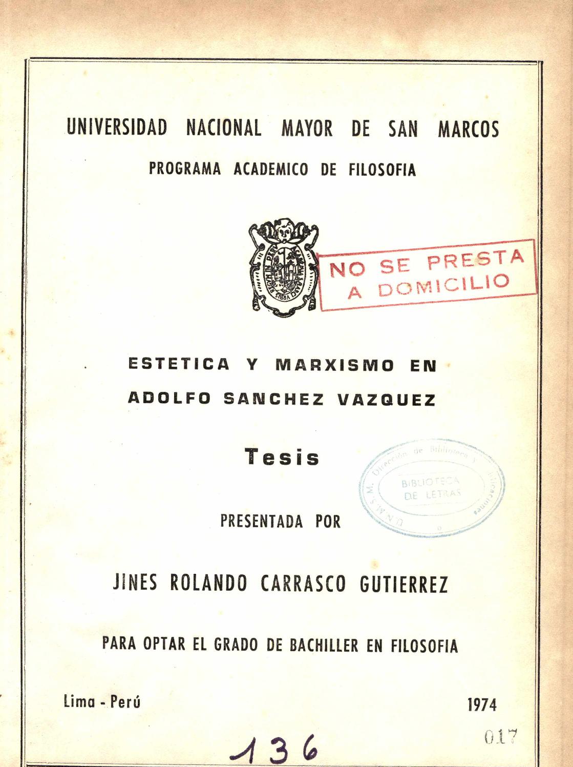 Carrasco, J. (1974). Estética y marxismo en Adolfo Sánchez Vázquez [Tesis para optar el grado de Bachiller en Filosofía]. Universidad Nacional Mayor de San Marcos. Facultad de Letras y Ciencias Humanas. Unidad de Pregrado.