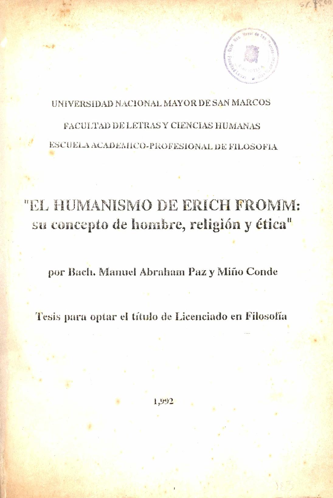 Paz, M. & Conde, M. (1992). El humanismo de Erich Fromm: su concepto de hombre, religión y ética [Tesis para optar el grado de licenciado en Filosofía]. Universidad Nacional Mayor de San Marcos. Facultad de Letras y Ciencias Humanas. Unidad de Pregrado.