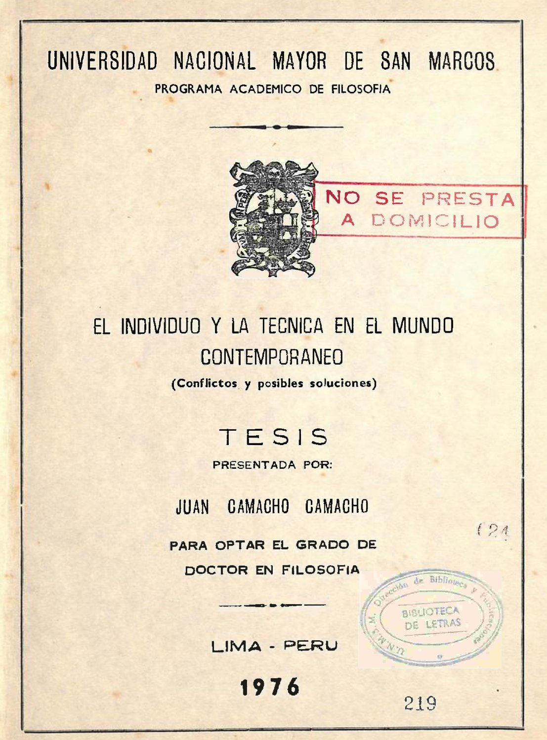 Camacho, J. (1976). El individuo y la técnica en el mundo contemporáneo (Conflictos y posibles soluciones). [Tesis para optar el grado de Doctor en Filosofía]. Universidad Nacional Mayor de San Marcos. Facultad de Letras y Ciencias Humanas. Unidad de Posgrado.