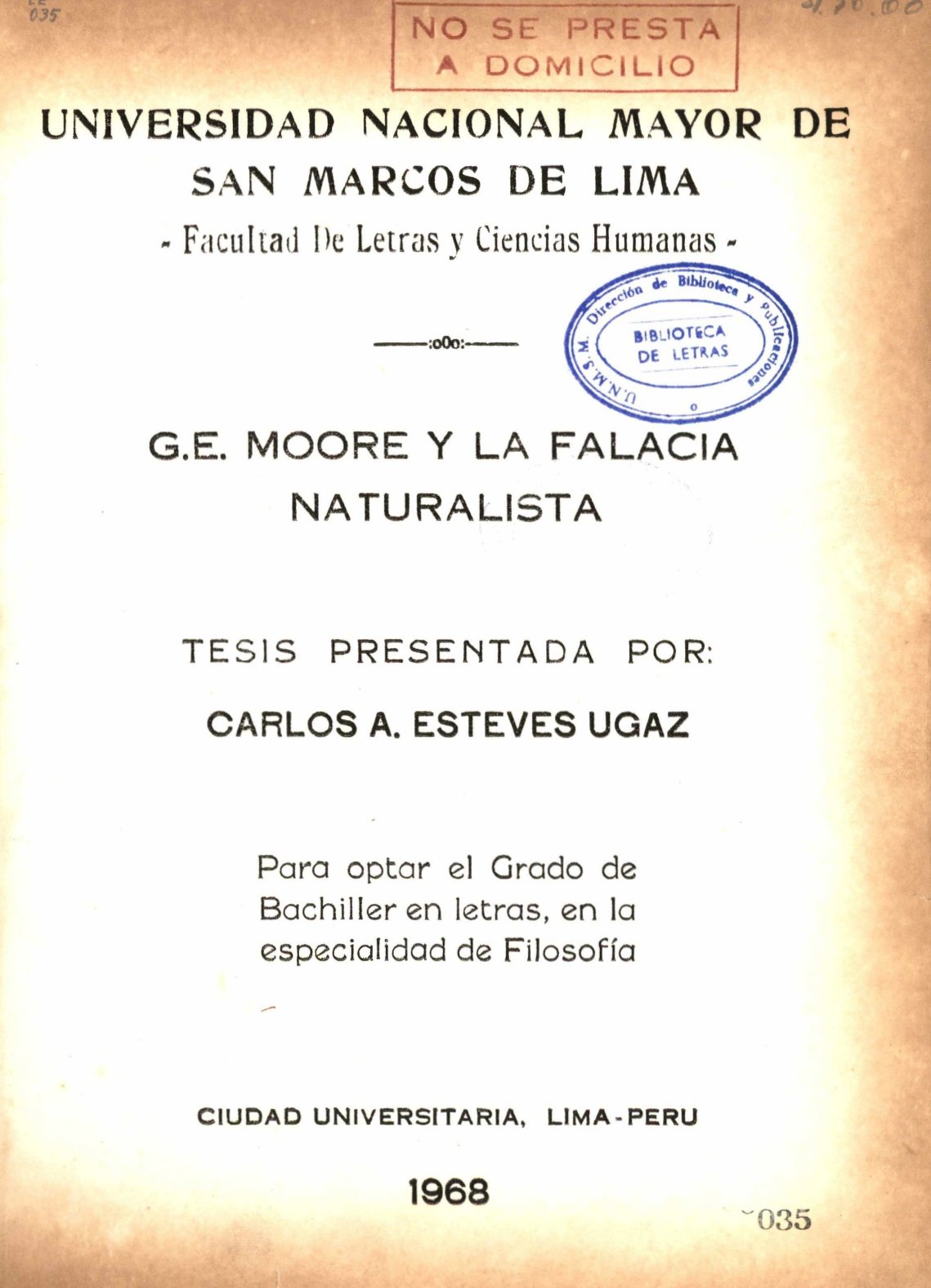 Esteves, C. (1968). G.E. Moore y la falacia naturalista [Tesis para optar el grado de Bachiller en Filosofía]. Universidad Nacional Mayor de San Marcos. Facultad de Letras y Ciencias Humanas. Unidad de Pregrado.