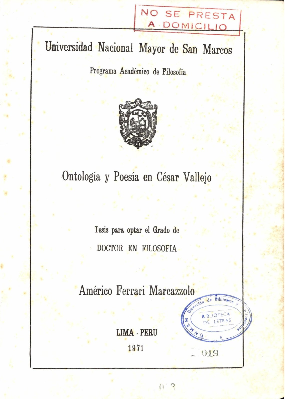 Ferrari, A. (1971). Ontología y poesía en César Vallejo [Tesis para optar el grado de Doctor en Filosofía]. Universidad Nacional Mayor de San Marcos. Facultad de Letras y Ciencias Humanas. Unidad de Posgrado.