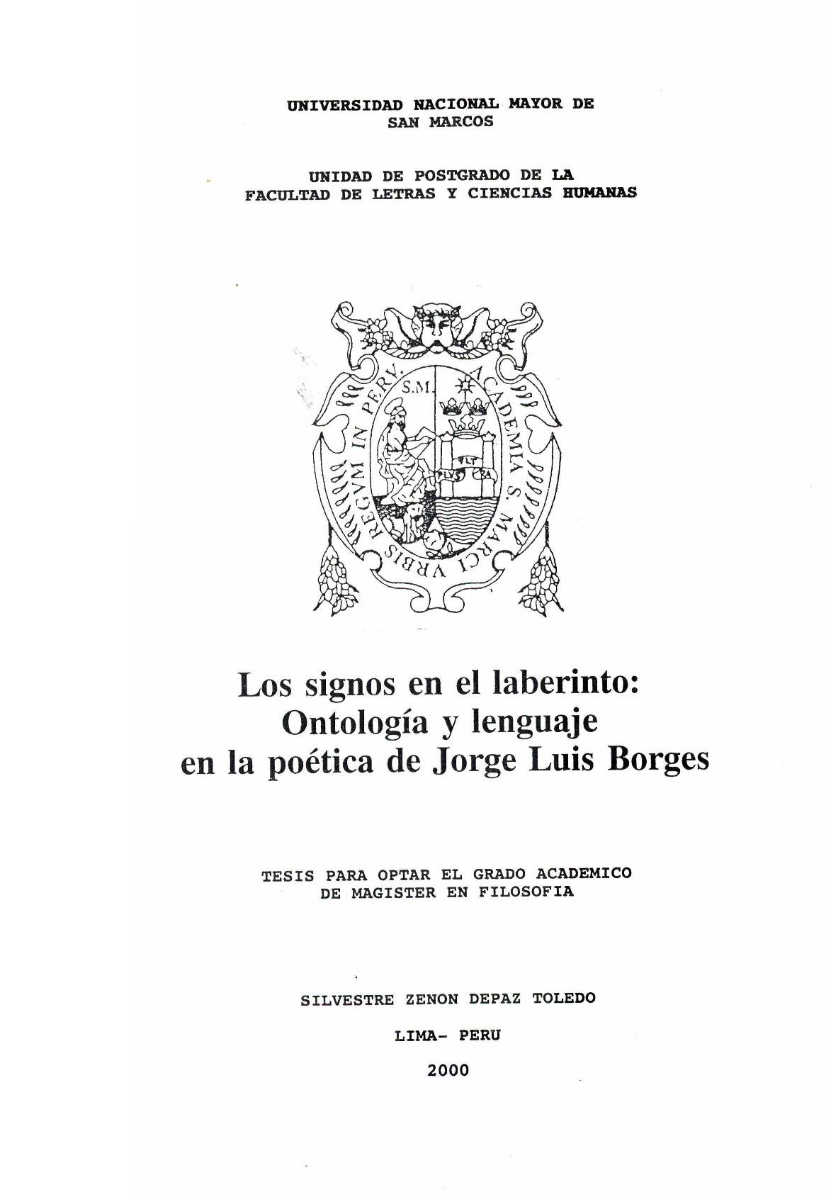 Depaz, Z. (2000). Los signos en el laberinto: Ontología y lenguaje en la poética de Jorge Luis Borges. [Tesis para optar el grado de Magíster en Filosofía]. Universidad Nacional Mayor de San Marcos. Facultad de Letras y Ciencias Humanas. Unidad de Posgrado.