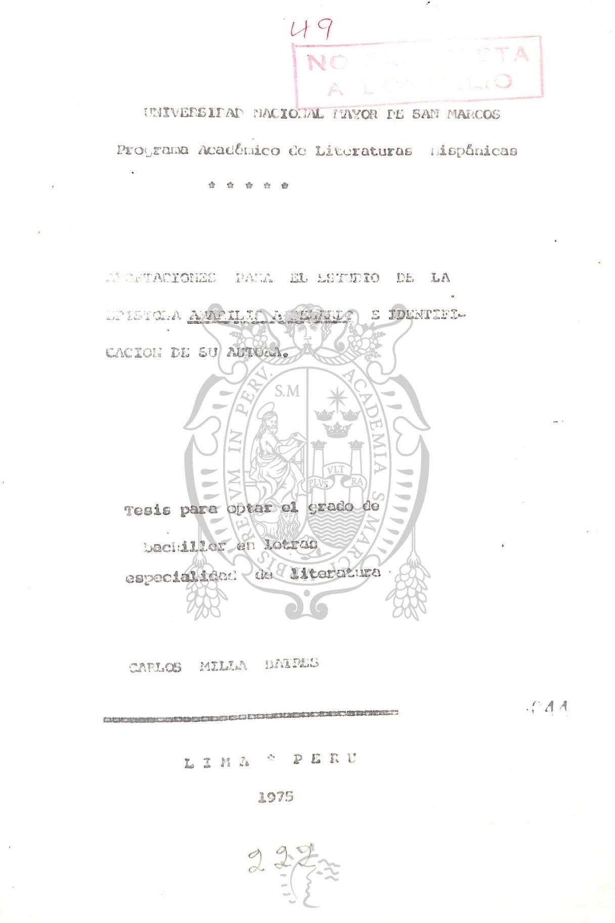 Milla, C. (1975) Aportaciones para el estudio de la epístola «Amarilis a Belardo» e identificación de su autora. [Tesis para optar el grado de bachiller]. Universidad Nacional Mayor de San Marcos. Facultad de Letras y Ciencias Humanas. Unidad de Pregrado.