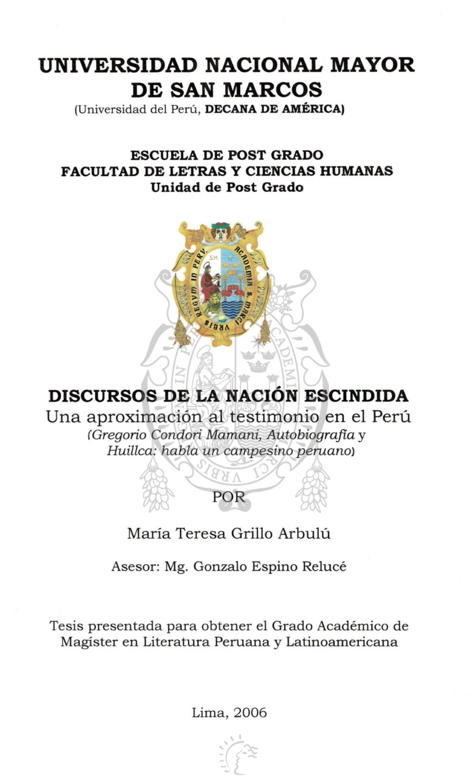 Discursos de la nación escindida. Una aproximación al testimonio en el Perú. (Gregorio Condori Mamani, autobiografía y Huillca: habla un campesino peruano)