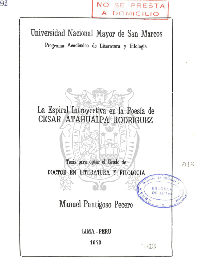 Pantigoso, M. (1970) La espiral introyectiva en la poesía de César Atahualpa Rodríguez. [Tesis para optar el grado de Doctor]. Universidad Nacional Mayor de San Marcos. Facultad de Letras y Ciencias Humanas. Unidad de Posgrado.