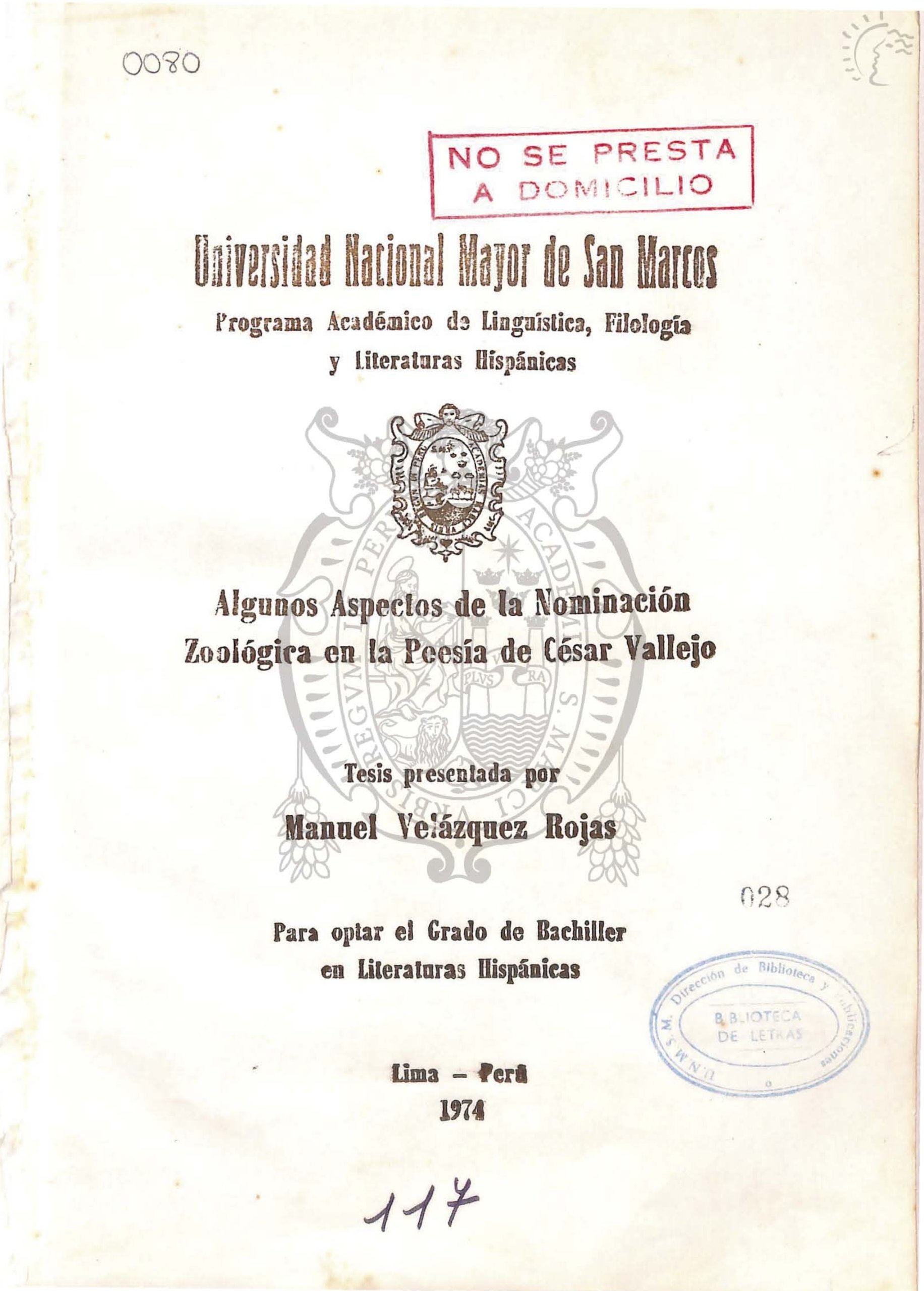 Velázquez, M. (1974) Algunos aspectos de la nominación zoológica en la poesía de César Vallejo. [Tesis para optar el grado de Bachiller en Literaturas Hispánicas]. Universidad Nacional Mayor de San Marcos. Facultad de Letras y Ciencias Humanas. Unidad de Pregrado.