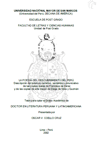 La poesía del descubrimiento del Perú: Descripción del estatuto narrativo, semántico y enunciativo de las coplas reales de Francisco de Xerez y de las coplas de arte mayor de Diego de Silva y Guzmán