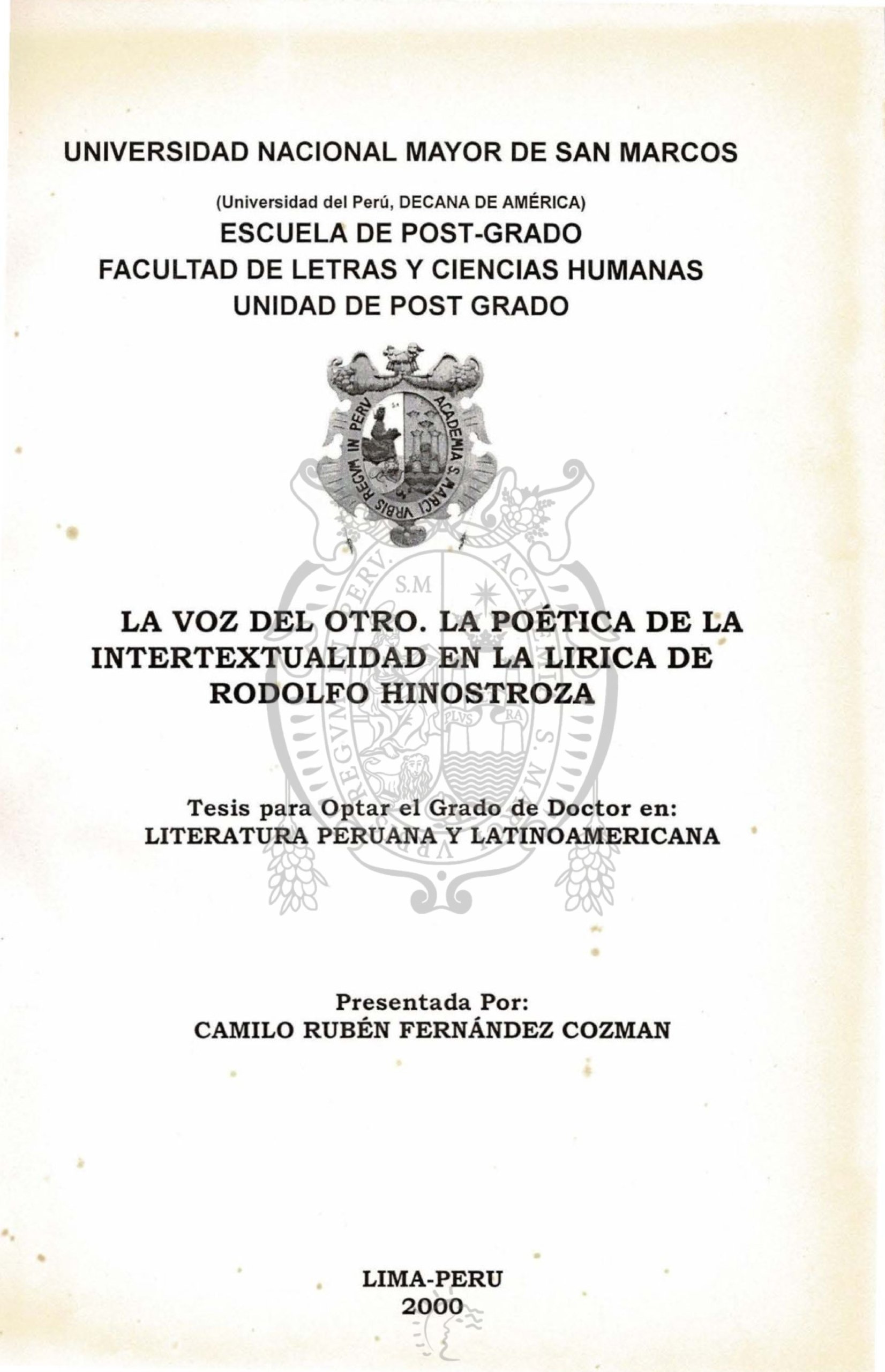 HomeArticulosTesis digitalesLiteraturaLa voz del otro. La poética de la intertextualidad en la lírica de Rodolfo HinostrozaLa voz del otro. La poética de la intertextualidad en la lírica de Rodolfo Hinostroza Additional information Autor : Fernandez Cozman, Camilo. Año de publicación: 2000. Tipo de tesis : Tesis de doctorado. Ver resúmen Ver más Descripción